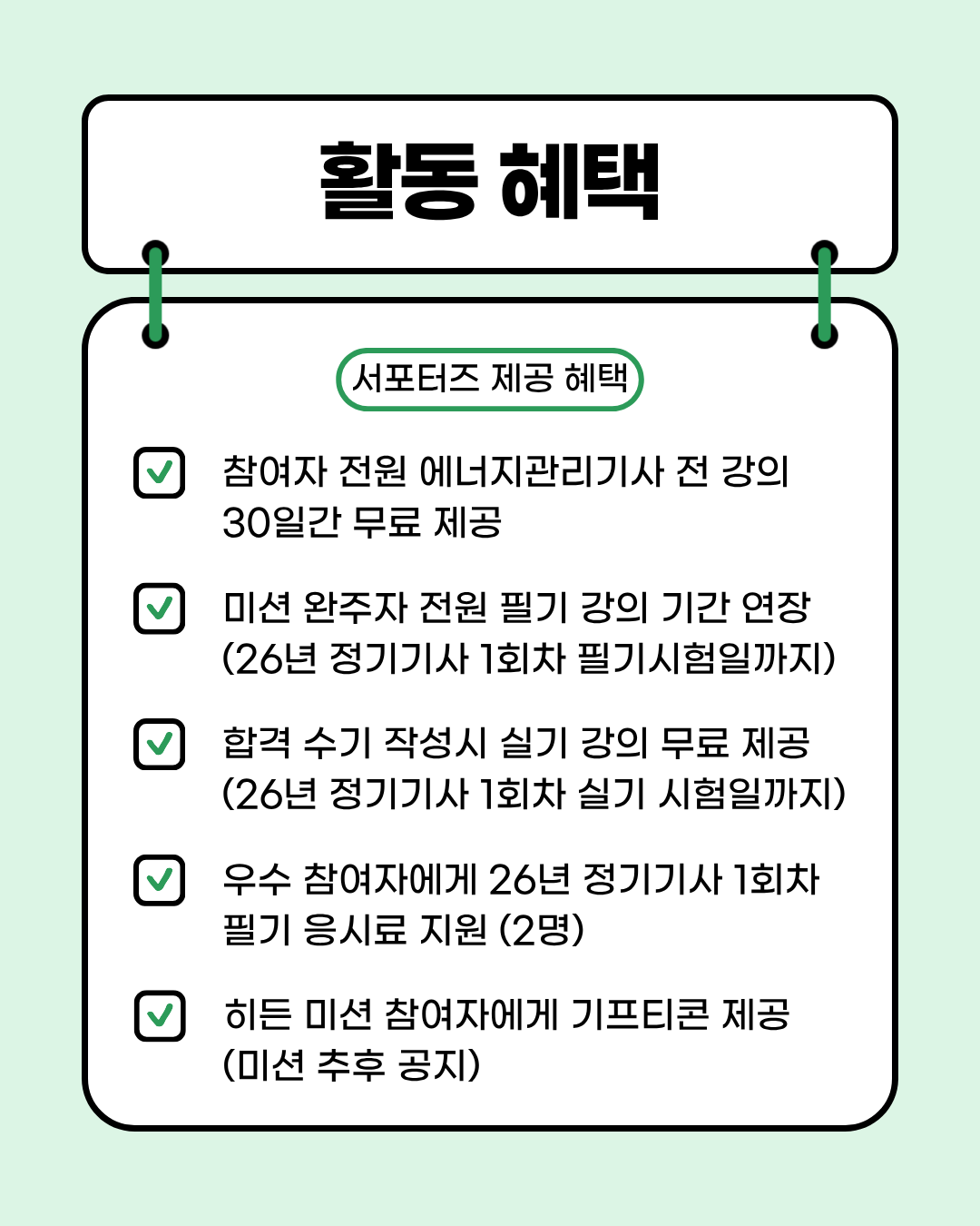 Ȱµ¿ ÇýÅÃ🎁 1. 30ÀÏ °£ ¿¡³ÊÁö°ü¸®±â»ç Çʱâ Àü °ÀÇ ¹«·á Á¦°ø (*±³Àç º°µµ ±¸¸Å) 2. ¹Ì¼Ç ¿ÏÁÖÀÚ Çʱ⠰ÀÇ ±â°£ ¿¬Àå (2026³â Á¤±â±â»ç 1ȸÂ÷ Çʱâ½ÃÇèÀϱîÁö) 3. Çհݼö±â ÀÛ¼º ½Ã ½Ç±â°ÀÇ ¹«·á Á¦°ø (2026³â Á¤±â±â»ç 1ȸÂ÷ ½Ç±â½ÃÇèÀϱîÁö) 4.¿ì¼ö Âü¿©ÀÚ¿¡°Ô 2026³â Á¤±â±â»ç 1ȸÂ÷ Çʱâ ÀÀ½Ã·á Áö¿ø (2¸í) 5. È÷µç ¹Ì¼Ç Âü¿©ÀÚ¿¡°Ô ±âÇÁƼÄÜ Á¦°ø