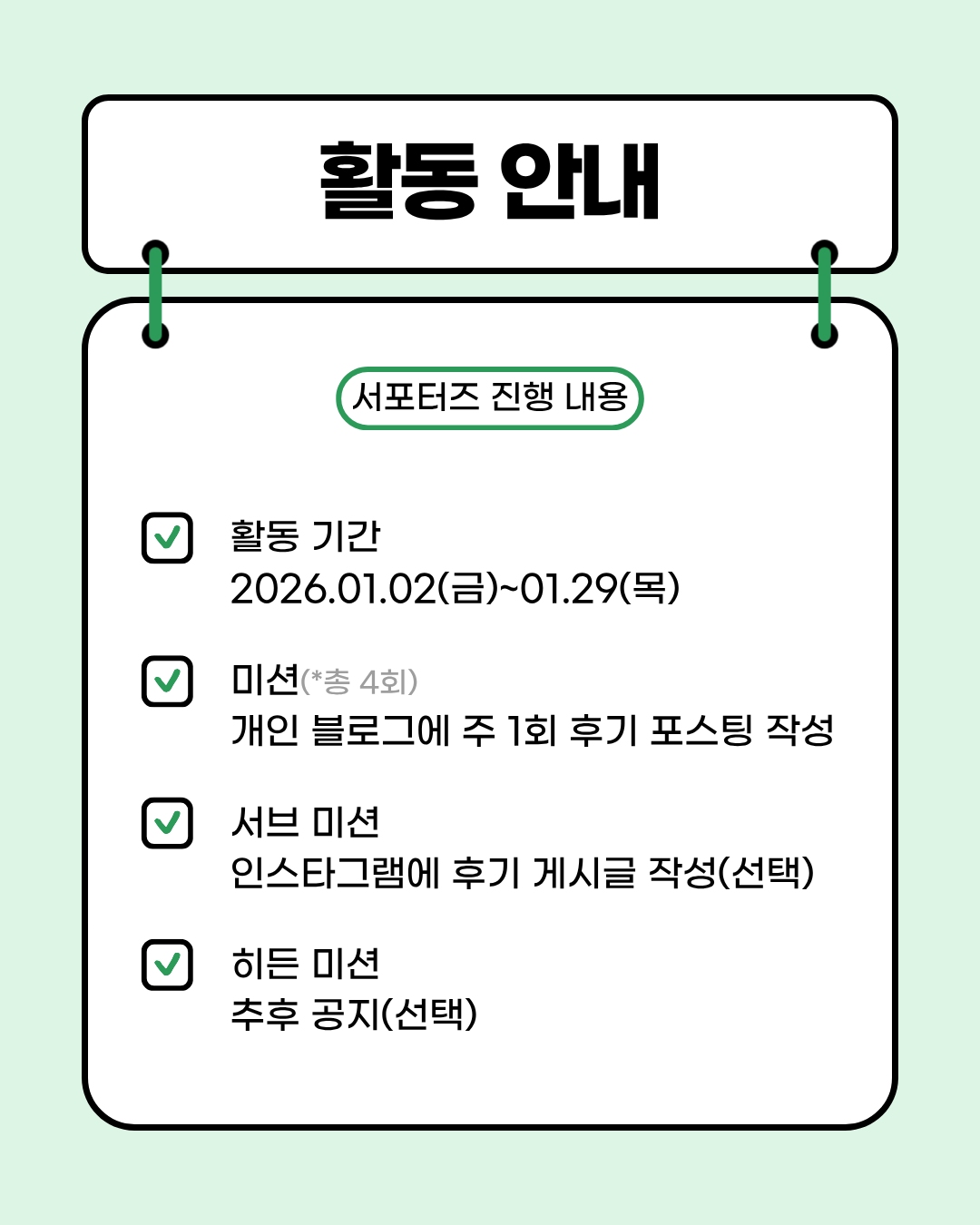 Ȱµ¿ ¾È³» ✅Ȱµ¿ ±â°£: 1¿ù 2ÀÏ(±Ý) ~ 1¿ù 29ÀÏ(¸ñ) ✅¹Ì¼Ç: °³ÀÎ ºí·Î±×¿¡ ÁÖ 1ȸ ÈÄ±â Æ÷½ºÆÃ ÀÛ¼º *ÃÑ 4ȸ (Çʼö) ✅¼ºê ¹Ì¼Ç: ÀνºÅ¸±×·¥¿¡ ÈÄ±â Æ÷½ºÆÃ ÀÛ¼º (¼±ÅÃ) ✅È÷µç ¹Ì¼Ç: ÃßÈÄ °øÁö (Âü¿© ½Ã ±âÇÁƼÄÜ Á¦°ø) ¡Ø¼ºê ¹Ì¼Ç ¼öÇà ½Ã ¿ì¼ö Âü¿©ÀÚ·Î ¼±Á¤µÉ °¡´É¼º UP!